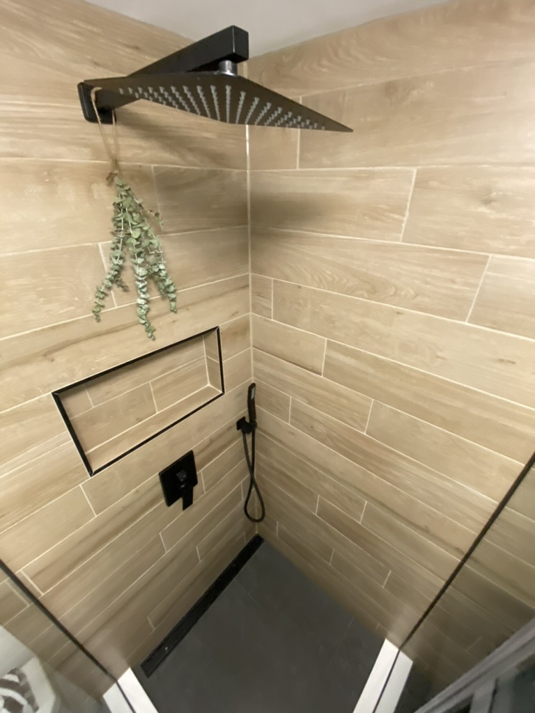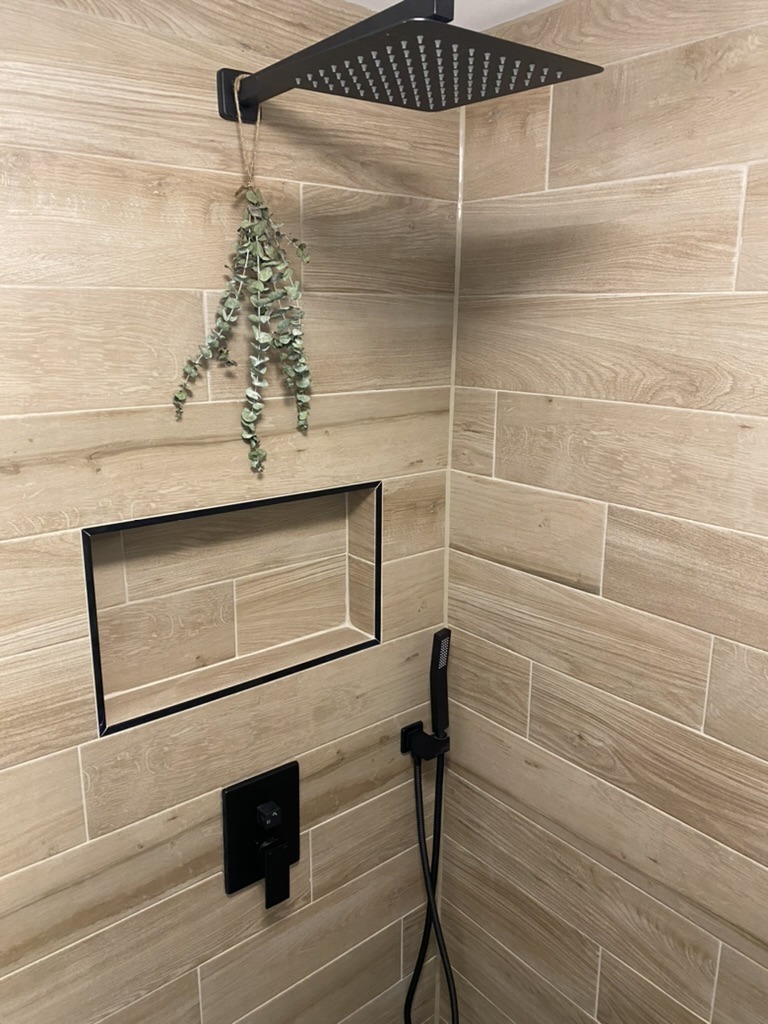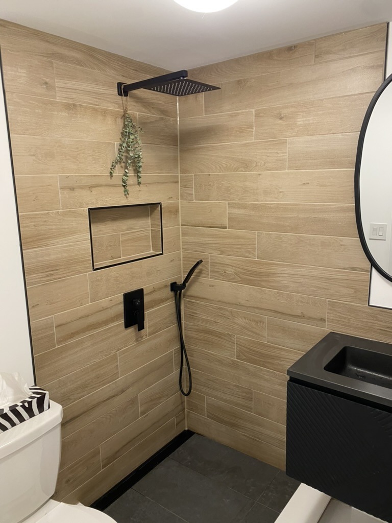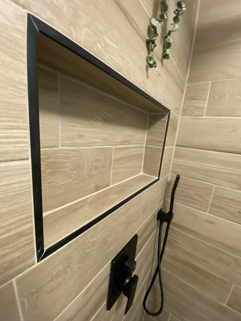 The new custom tile shower featured a wood-look style tile that offered warmth and texture while maintaining durability. We incorporated a shower niche for practical storage and installed an open glass divider, keeping the space bright and expansive.